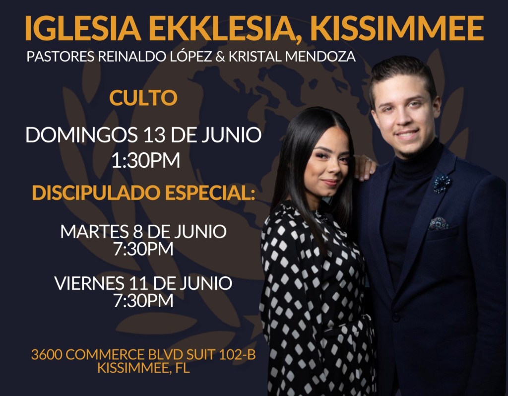 La Iglesia Ekklesia estará hubicada en el 3600 Commerce Blvd Suit 102-B Kissimmee Florida y los servicios serán los Martes 7:30pm – Enseñanza y Domingos 10:30am – Culto de Adoración y Ministración de la palabra.