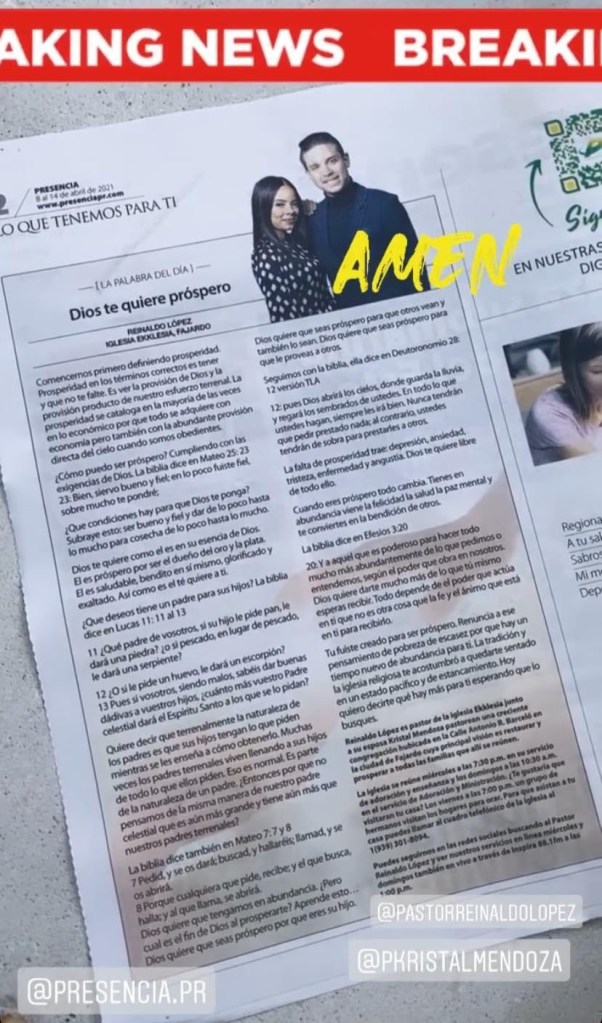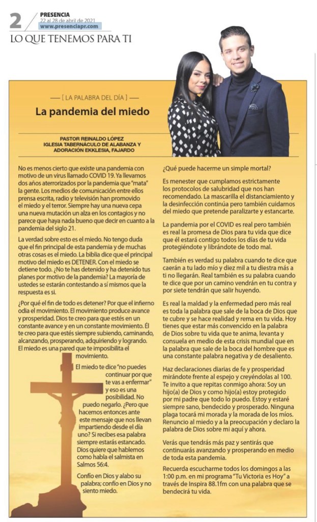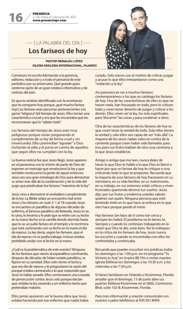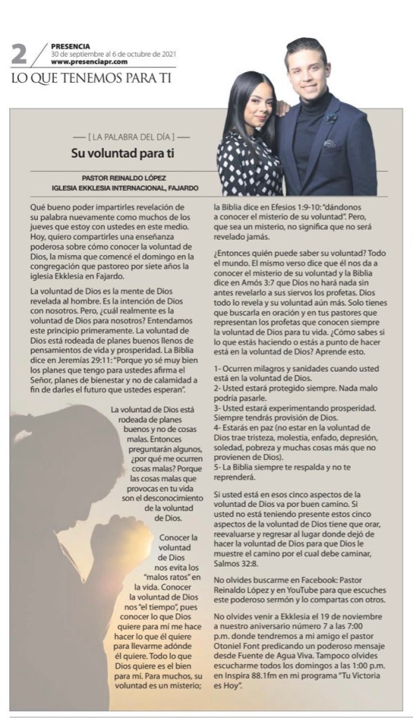 Escritos en el Periódico Presencia PR 11 Ago 202130 Sep 2021Ekklesia Media El Pastor Reinaldo López es escritor de notas para el periódico Presencia de Puerto Rico cuyas páginas las utiliza para plasmar escritos que se asocian con sus sermones dominicales predicados en el auditorio de su iglesia Ekklesia en Fajardo. Comparte esto: Haz clic para compartir en X (Se abre en una ventana nueva) X Haz clic para compartir en Facebook (Se abre en una ventana nueva) Facebook Me gusta Cargando...