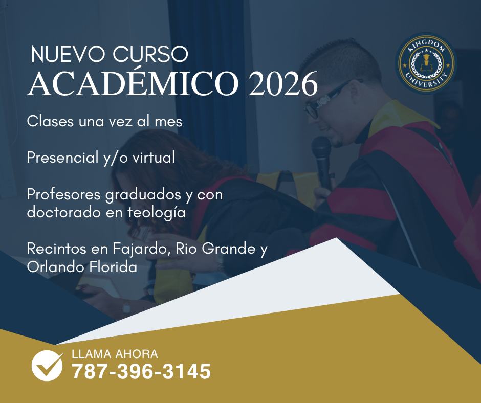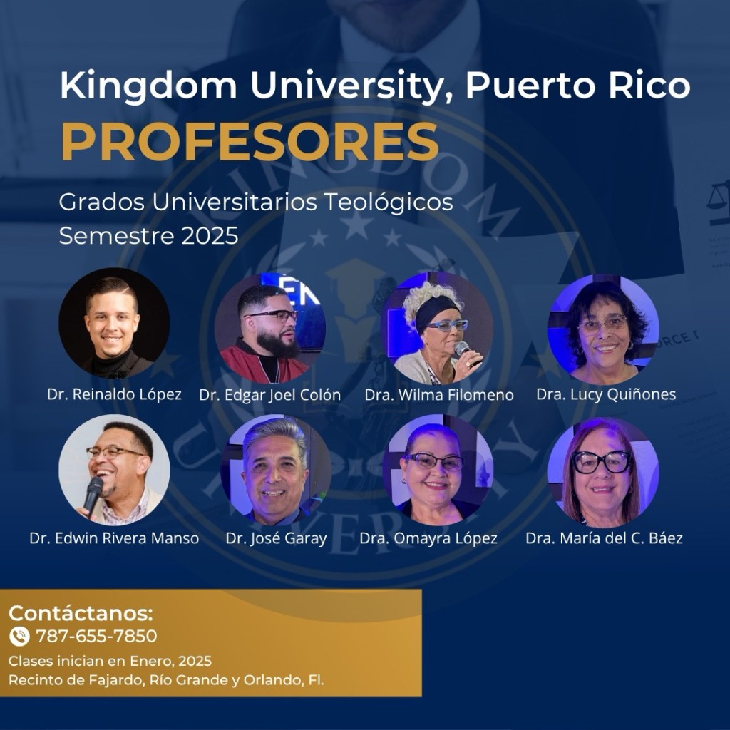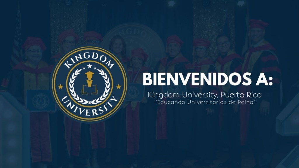 Kingdom University, Puerto Rico es una institución educativa cristiana organizada y registrada en el gobierno de Puerto Rico que ofrece grados asociados, bachillerato, maestría y doctorado en teología (este año 2026 la concentración es en Consejería Cristiana). Las clases se celebran un sábado al mes según la agenda ofrecida por el decanato y los horarios son de 9:00am a 12:00 del medio dia.